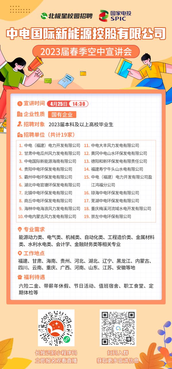 【国有企业】【电力行业五大六小】【国家电投集团】 中电国际新能源控股有限公司宣讲会 ------------------ 宣讲时间:4月25日14:30 招聘对象:23届本科及以上高校毕业生